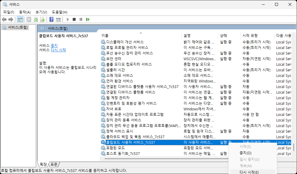서비스 창에서 클립보드 사용자 서비스를 찾으세요.