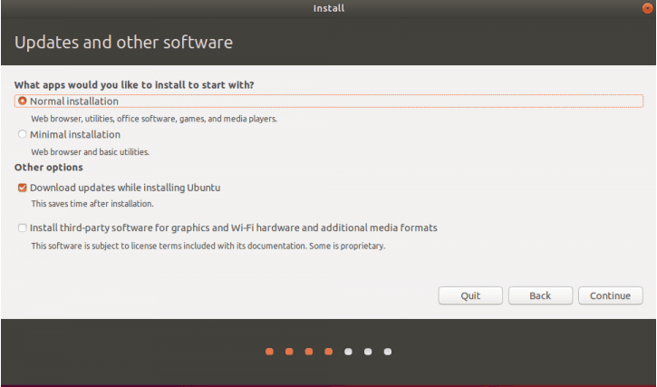 업데이트 및 소프트웨어에서는 일반설치를 선택하고, 다른 옵션을 둘다 체크한다.