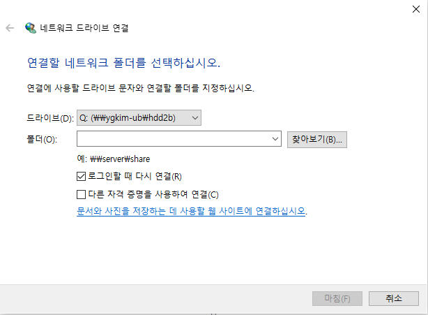 윈도우에서 네트워크 드라이브 연결