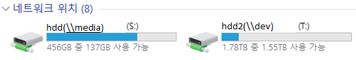 네트워크 드라이브 \\media를 hdd이름으로 S: 드라이브에 매핑했다고 하자. 파일 검색기에서 매핑된 드라이브 문자 S: 옆에 네트워크 드라이브 명이 보여진다.