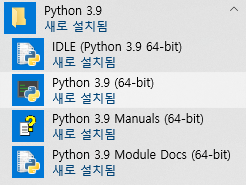 윈도우 좌측 하단에서 `시작 > 프로그램 > python 3.9 > Python 3.9 (64bits)` 을 실행한다.