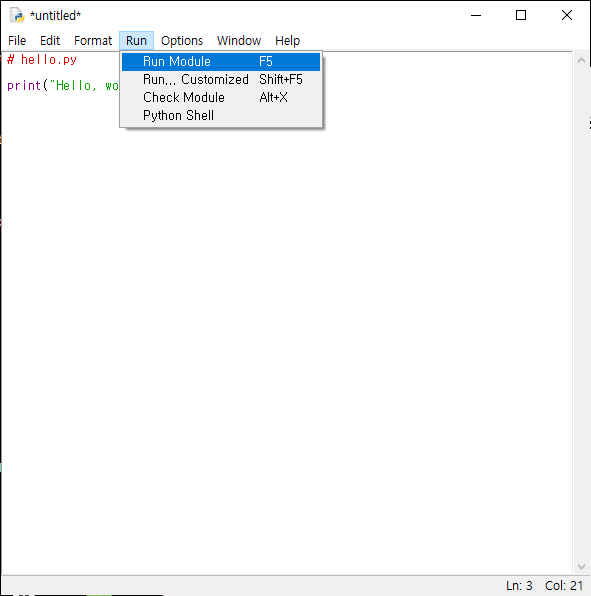 상단 메뉴에서 `Run > Run Module` 눌러 실행해보자. Matlab과 같이 F5를 눌러도 동일하게 실행할 수 있다.