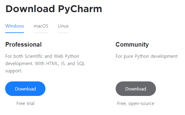 PyCharm은 파이썬 전용 에디터로, 코드 자동 완성, 문법 체크 등 편리한 기능을 많이 제공한다. PyCharm은 공식 사이트 (http://www.jetbrains.com/pycharm/download) 에서 다운로드할 수 있다. 사이트에 들어가면, `Download PyCharm` 화면에서 좌측 `Windows` 탭을 선택 후, 무료 설치가능한 Community 를 선택후 `Download`버튼을 클릭하면, 설치를 시작한다.