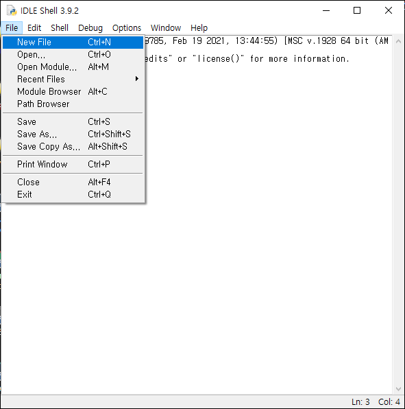 - Shell window: 실행 결과 표시, 셀과 동일 기능 수행, IDLE 실행 시 출력된다