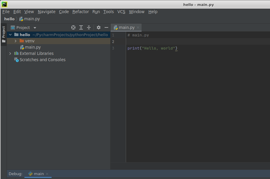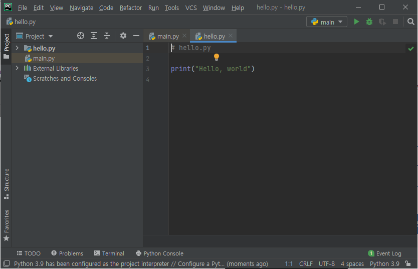 hello라는 프로젝트 안에 `main.py`파일이 생성되고, 기존의 모든 코드들을 제거한 후 다음과 같이 `Hello, world`를 출력하는 코드만 생성해서 실행해보자.