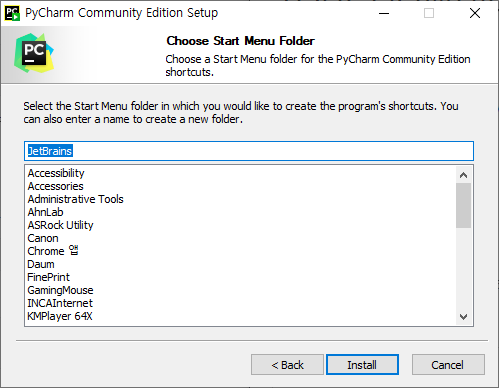 시작 메뉴 폴더를 설정하고, `Next`를 누르면 설치를 시작한다.