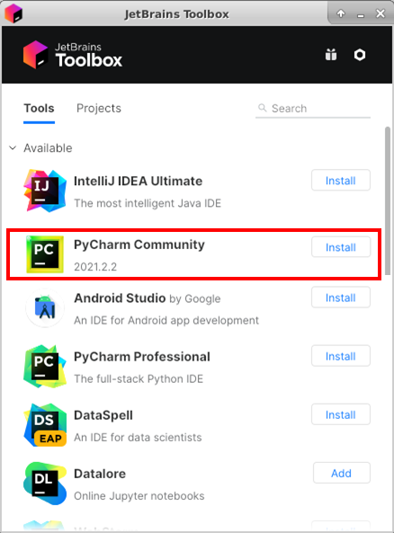 툴박스가 실행되면, `PyCharm Community`를 선택하고, 우측의 `Install` 버튼을 눌러, 설치를 진행한다.