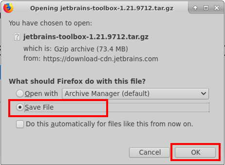 `jetbrains-toolbox-<버전>.tar.gz` 파일을 `Save File`을 선택 후 `OK` 버튼을 눌러 저장한다.