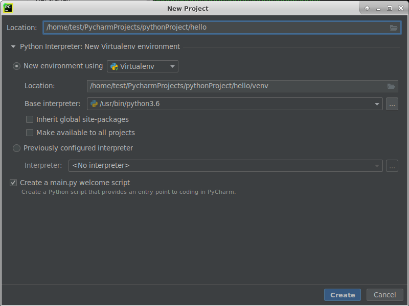 `New Project`를 선택하고, 다음과 같이 Location의 끝에 `hello`를 추가하고, `Create` 버튼을 눌러, `hello`라는 프로젝트를 만들어보자.