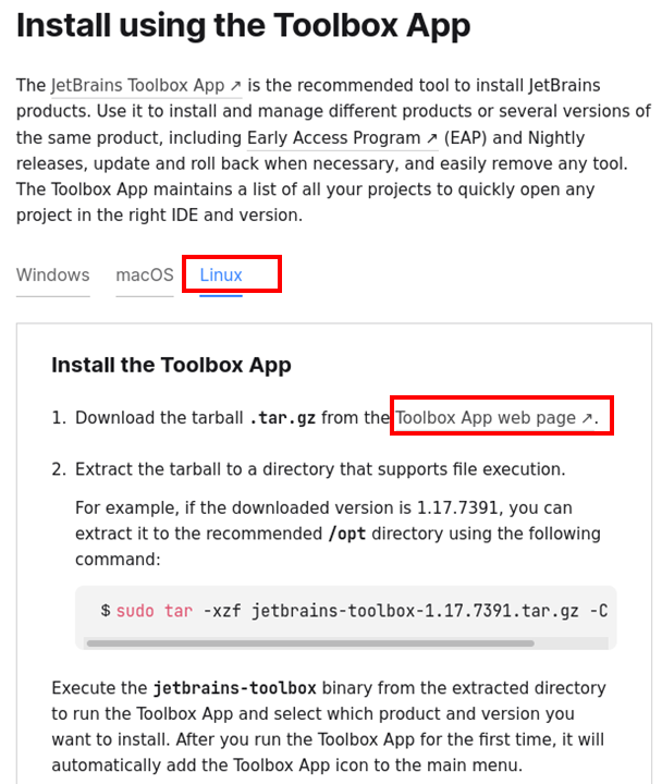 PyCharm은 파이썬 전용 에디터로, 코드 자동 완성, 문법 체크 등 편리한 기능을 많이 제공한다. PyCharm 리눅스 버전은 공식 사이트 (http://www.jetbrains.com/pycharm/download) 에서 다운로드할 수 도 있지만, 설치 가이드(https://www.jetbrains.com/help/pycharm/installation-guide.html#toolbox)에서 툴박스를 받으면 더 쉽게 설치할 수 있다. 툴박스 앱 설치 사이트에 들어가서, `Linux` 탭을 선택 후, `Toolbox App web page`를 선택한다.