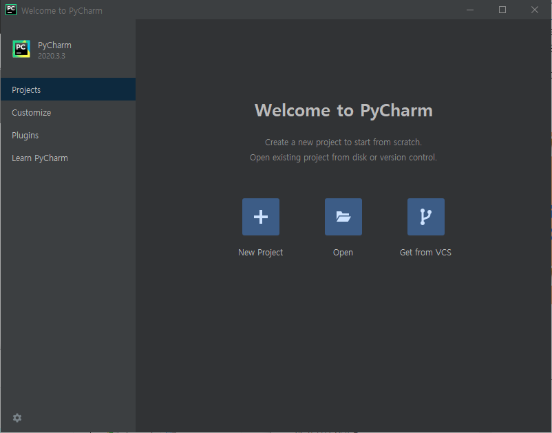 PyCharm을 실행하면, 다음과 같이 `Welcome to PyCharm`페이지가 열린다.