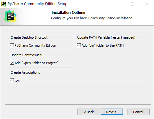 PyCharm Community Edition의 Desktop Shortcut을 생성하도록 체크하고,