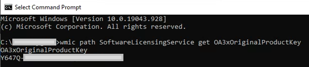 2. 아래 명령어를 입력하거나, 아래 첨부된 get_cdkey.txt파일을 다운로드하여 해당 내용을 복사하면, 아래 그림과 같이 BIOS에 입력된 OEM Product Key를 확인할 수 있습니다.