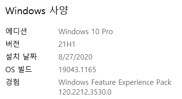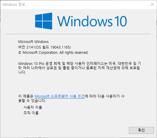 또는, 커맨드창에서 `winver`라고 입력해도 확인할 수 있습니다.