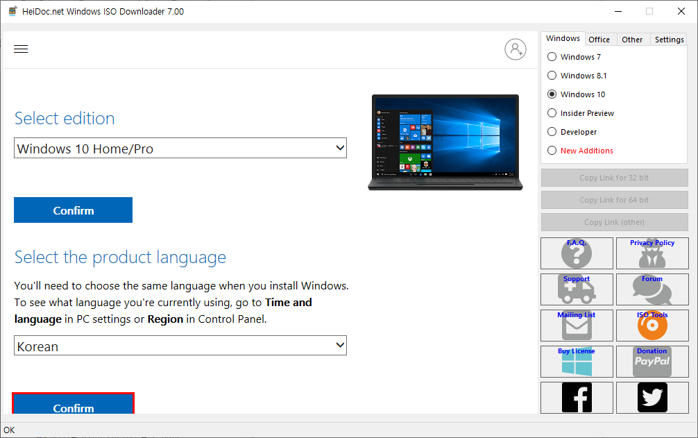 Windows 10 Home/Pro를 선택하고, 한글 버전을 선택하는 경우에는 아래와 같이 하면 됩니다.
