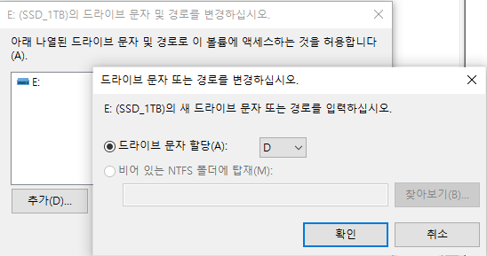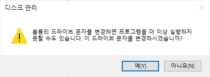 `드라이브 문자 또는 경로를 변경하십시오`라는 메시지 창이 열리면, `드라이브 문자할당`을 선택하고, 우측 선택창에서 원하는 드라이브 문자를 선택후 확인을 누르면 됩니다.