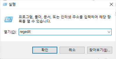 를 입력하고 실행한다. 혹은 `윈도우+R` 을 눌러서 실행창이 나오면 `regedit`을 입력해도 됩니다.
