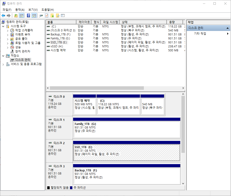 컴퓨터 관리창에 열리면, 드라이브 문자를 변경하고자하는 HDD나 SSD를 선택합니다.