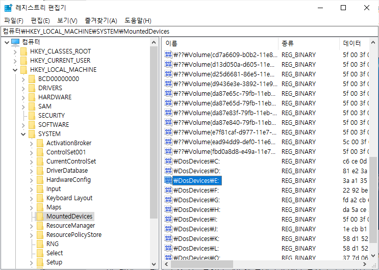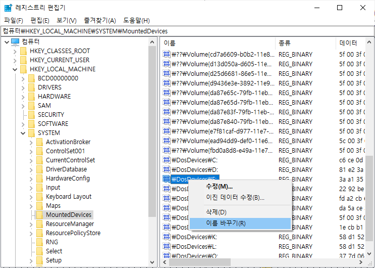 레지스트리 편집기가 실행되면, 좌측 `컴퓨터 > HKEY_LOCAL_MACHINE > SYSTEM > MountedDevices`에 들어가서, `DosDevices`라고 시작되는 이름중에 해당 드라이브를 찾아서 이름 바꾸기