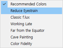 f.lux메뉴를 열고, 우측 상단의 `Recommended Colors`를 누르면, 원하는 색상들을 선택할 수 있습니다.