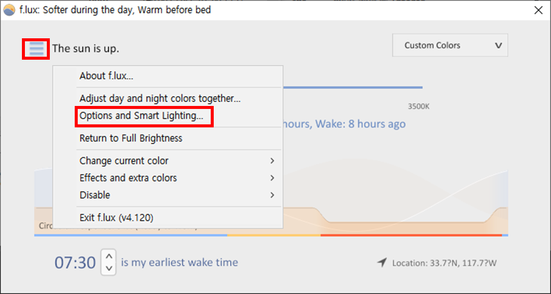 좌측에서 f.lux 메뉴[=]를 선택하고, `Options and Smart Lighting`을 클릭합니다.