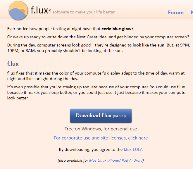 홈페이지에 접속하면, 중간에 `Download f.lux`라는 버튼을 클릭합니다.