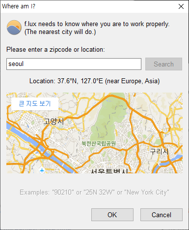 가장 먼저, 집주소나 지역을 입력하고, `Search`를 하면 f.lux를 해 뜨는 시간과 해지는 시간에 맞춰서 동작하도록 설정하게 됩니다