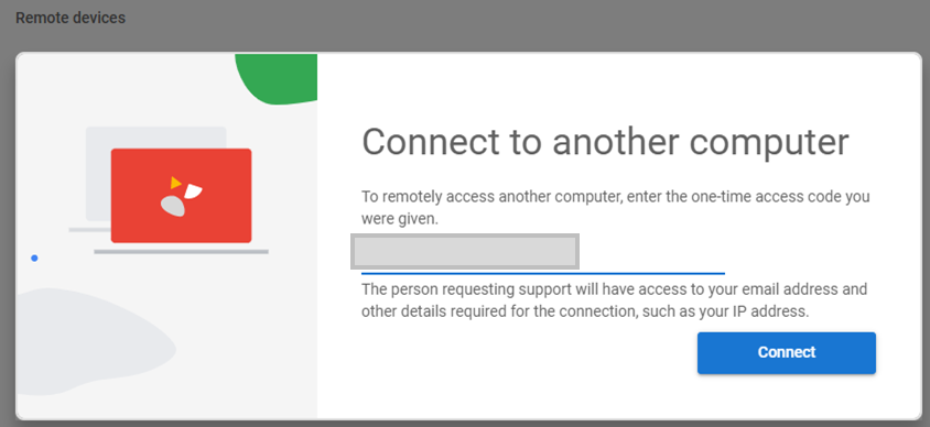 상대에게 번호를 알려주면, 상대는 아래 Remote devices에서 access code를 입력하고, `connect` 버튼을 누릅니다.