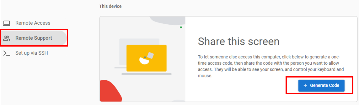 좌측에서 `Remote Support`를 선택하고, Share this screen에서 `Generate Code`를 선택합니다.