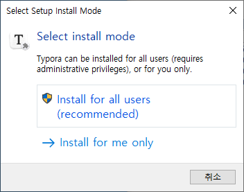 다운로드한 `typora-setup-x64.exe`를 실행한 후, 설치할 모드에서는 `Install for all users`를 선택합니다.