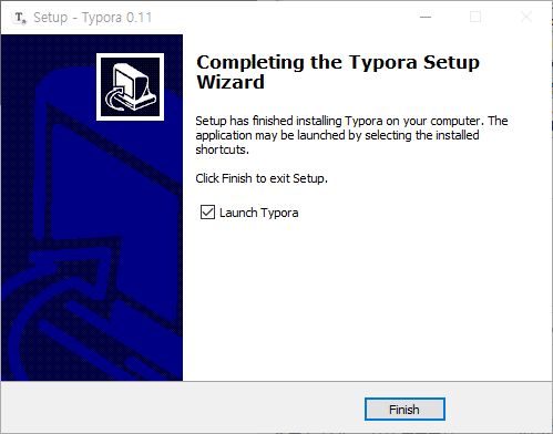 설치가 완료되면, Typora를 실행하도록, `[v] Launch Typra`를 선택하고, `Finish`를 누릅니다.