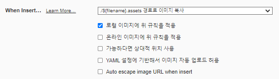 메뉴에서 `파일 > 환경설정 > 이미지`로 들어갑니다. 이미지 삽입시 이미지를 로컬 경로에 저장하면, 마크다운 파일들을 다른 폴더로 이동하거나, 마크다운 파일들과 이미지들을 함께 관리하기 쉬워집니다. 이를 위해서는 아래와 같이 `./$(filename).assets 경로로 이미지 복사`를 선택하고, `[v] 로컬 이미지에 위 규칙을 적용`을 선택합니다. 만약 `a.md` 파일을 생성하고, 그 파일에 어떤 이미지를 삽입하는 경우, 해당 이미지는 a.assets 폴더에 자동으로 복사됩니다.