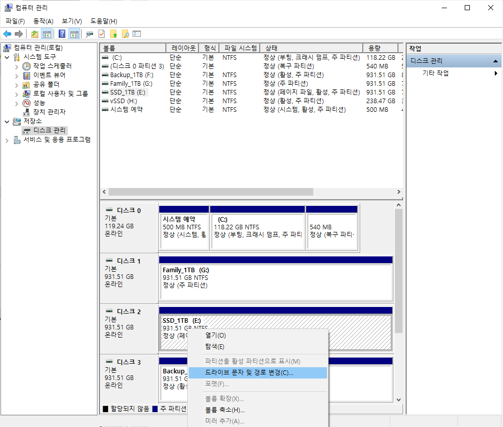 아래와 같이 E 드라이브를 D 드라이브로 변경해기 위해, 해당 드라이브에서 우측 마우스 버튼을 누르고, 메뉴 중간의 드라이브 문자 및 경로 변경을 선택합니다.
