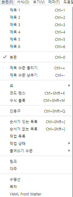Typora에서는 본문에 관련된 기본 사용법을 메뉴를 통해 확인할 수 있습니다.