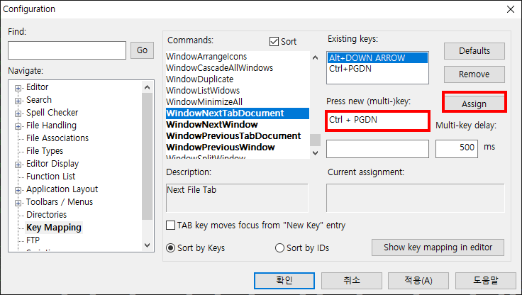 울트라 에디트에서 열린 창들을 전,후로 이동하는 키는 기본적으로 Alt + up/down 으로 설정되어 있습니다. 만약, 다음창으로 넘어가는 키를 다른 키로 설정하기 위해서는 Commands에서 `[v] Sort`를 선택후, `WindowNextTabDocument`를 찾아 선택한 다음, Press new key에서 원하는 키를 누른 후, `Assign`버튼을 누릅니다.