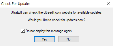 프로그램이 실행되면, 다음과 같이 update관련 여부를 묻는 대화상자가 보여집니다. UltraEdit는 보통 해당 버전에 대한 Serial Key를 받게 되므로, Update까지 지원하지 않습니다. 따라서, `[v] Do not display this message again`을 선택하고, `No`를 누릅니다.