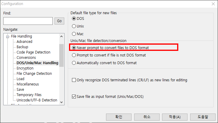 `Advanced > Configuration` 메뉴에 들어가서, 좌측 Navigate 메뉴에서 `File Handling > DOS/Unix/Mac Handling`을 선택합니다.