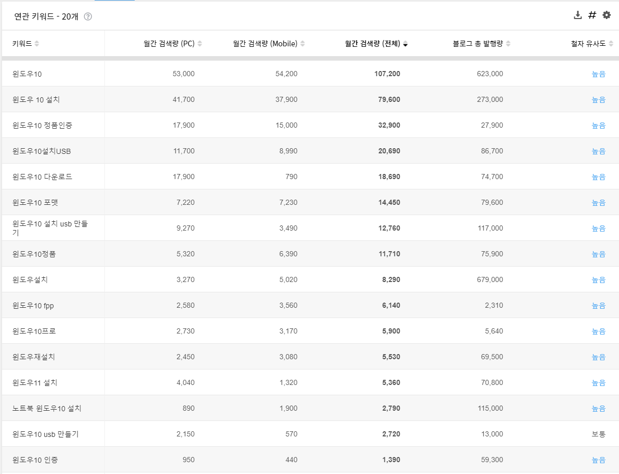 위에서 보면, `윈도우10` 키워드는 월간 검색량이 107,200 회지만, 블로그 총 발행량은 623,000 건이나 되기 때문에, 그 많은 웹페이지들과 경쟁해서 내 글을 상위 노출시키는 것은 초기부터 어렵다고 볼 수 있습니다.