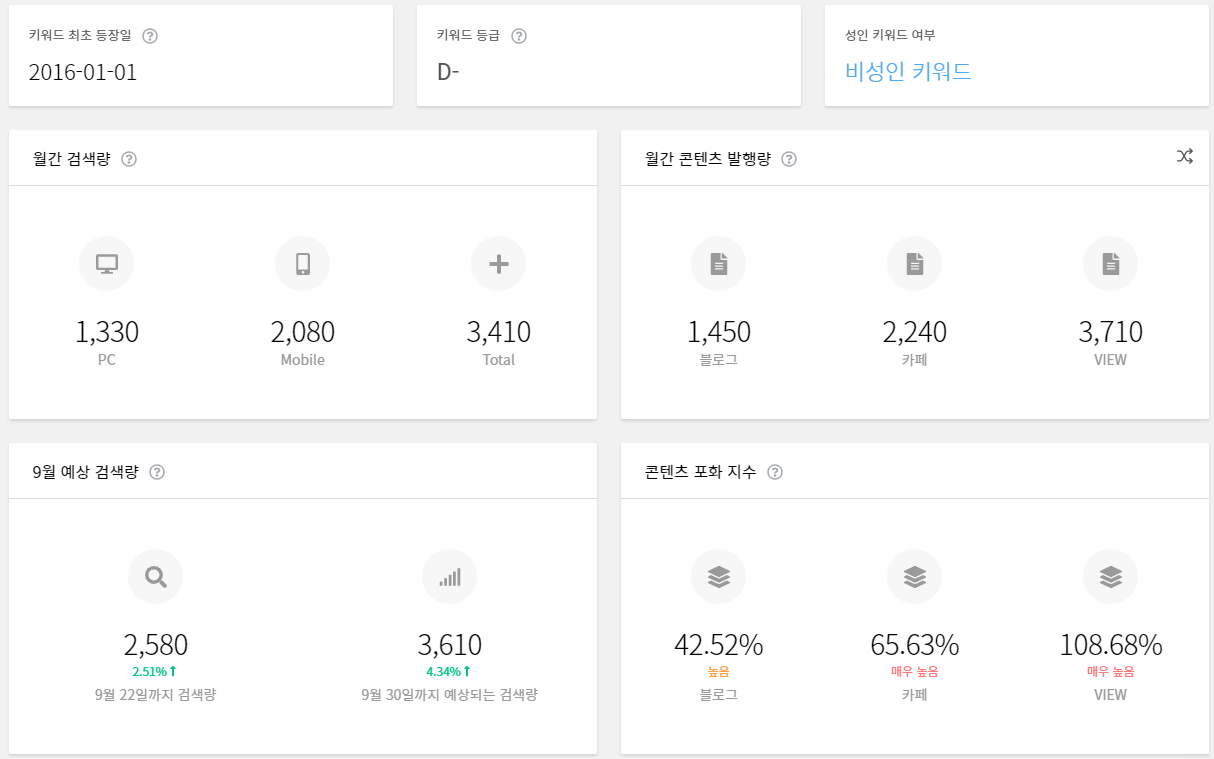 콘텐츠 포화지수: 블로그와 카페모두 매우 높은 상태입니다. 포화도는 기본적으로 월간 콘텐츠 발행량/월간 검색량으로 산출합니다. 즉, 발행량이 적고, 검색량이 많으면, 포화도가 낮게 됩니다.